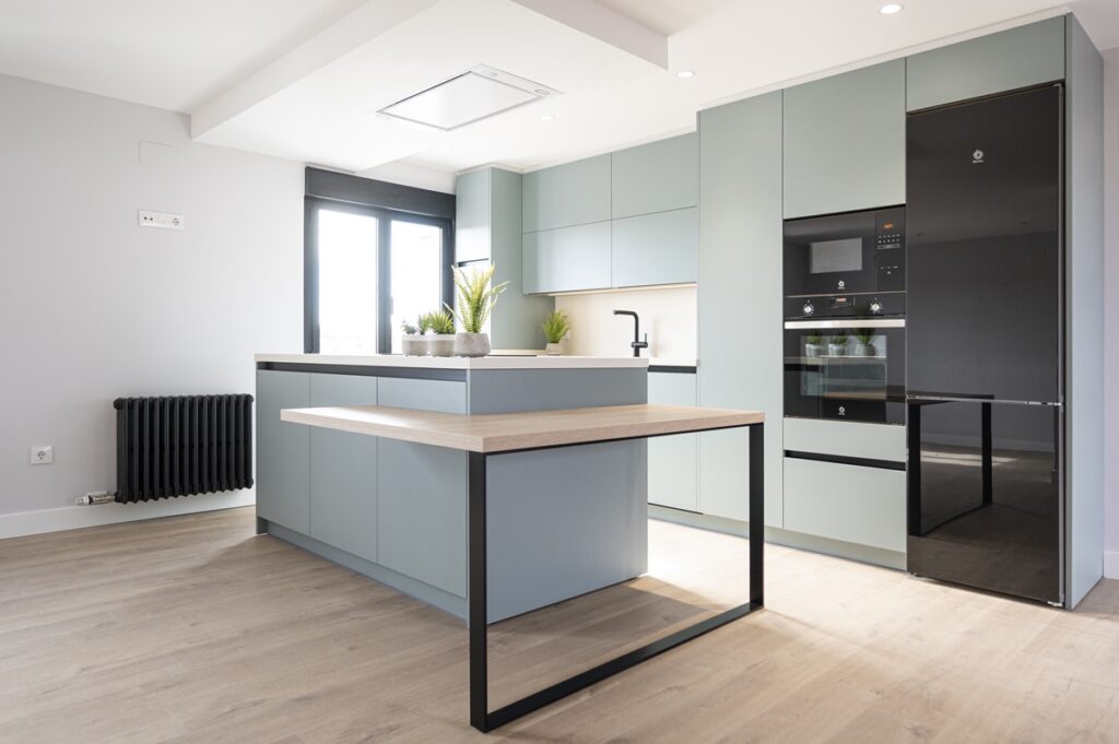 Hoy te presentamos una preciosa cocina en la que las puertas van en uno de los colores de moda, el verde fiordo. Unas personas lo ven azul y otras lo ven verde, ¿tu cómo lo ves? Lo que está claro es que es un color muy especial. Se trata de una cocina super amplia, abierta al salón con infinidad de posibilidades.