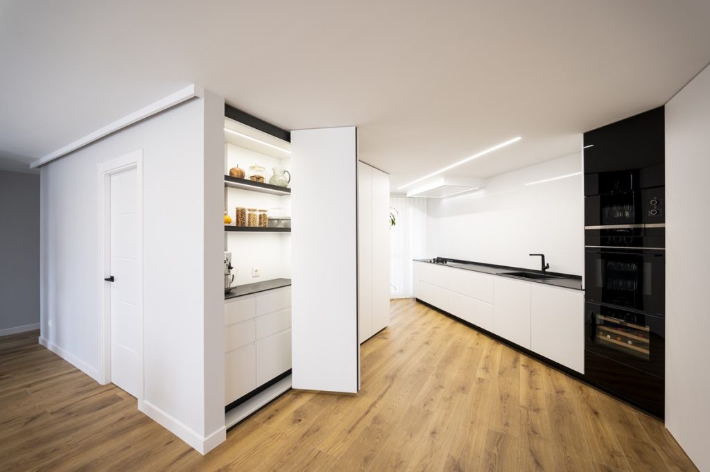En este proyecto os queremos presentar una reforma realizada con todo lujo de detalle, en la que se ha buscado crear una gran sala a la entrada de la vivienda que pueda aunar la cocina y el salón, ambos de grandes dimensiones y con una estética minimalista y con tan solo 2 colores el blanco y el negro.